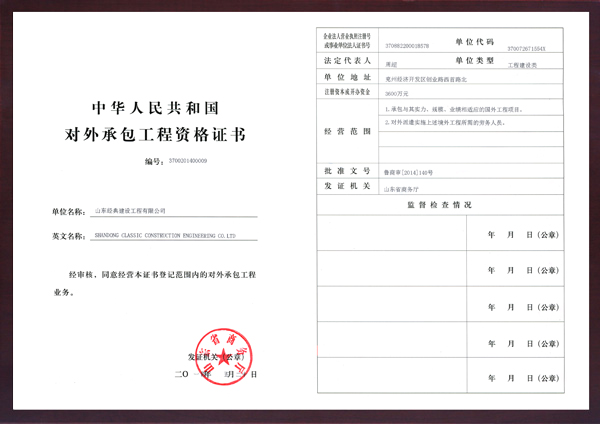 近日,山東經(jīng)典建設工程有限公司對外承包工程業(yè)務經(jīng)山東省商務廳批準,獲得了《中華人民共和國對外承包工程資格證書》。至此,山東經(jīng)典建設工程有限公司具備了承包對外工程項目資格。