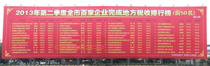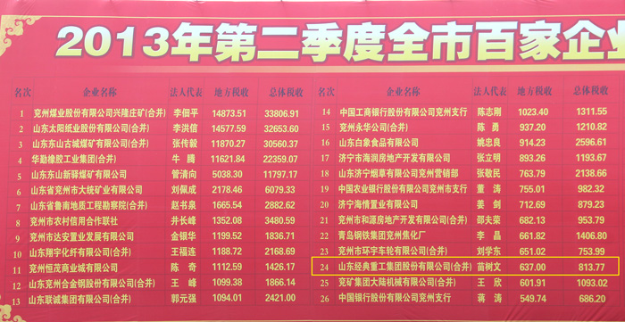 2013年7月7日,兗州市公布了第二季度納稅前50強(qiáng)企業(yè)排行榜,山東經(jīng)典重工集團(tuán)股份有限公司第二季度完成地方稅收637萬,總體稅收813.77萬,躍升兗州生產(chǎn)制造業(yè)前十強(qiáng)。全市排名第24位,比上一季度提升2位!
