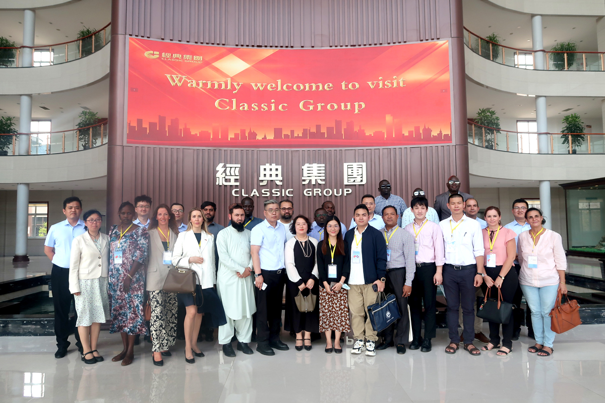 6月11日下午,由商務部主辦、山東外貿(mào)職業(yè)學院承辦的“發(fā)展中國家‘中國經(jīng)驗-中國社會制度與公共政策’研修班”一行20余人,在山東外貿(mào)職業(yè)學院援外培訓辦公室主任王保紅的帶隊下,蒞臨經(jīng)典集團參觀交流。經(jīng)典集團副總經(jīng)理兼生產(chǎn)總工張琦、副總經(jīng)理侯士輝陪同。