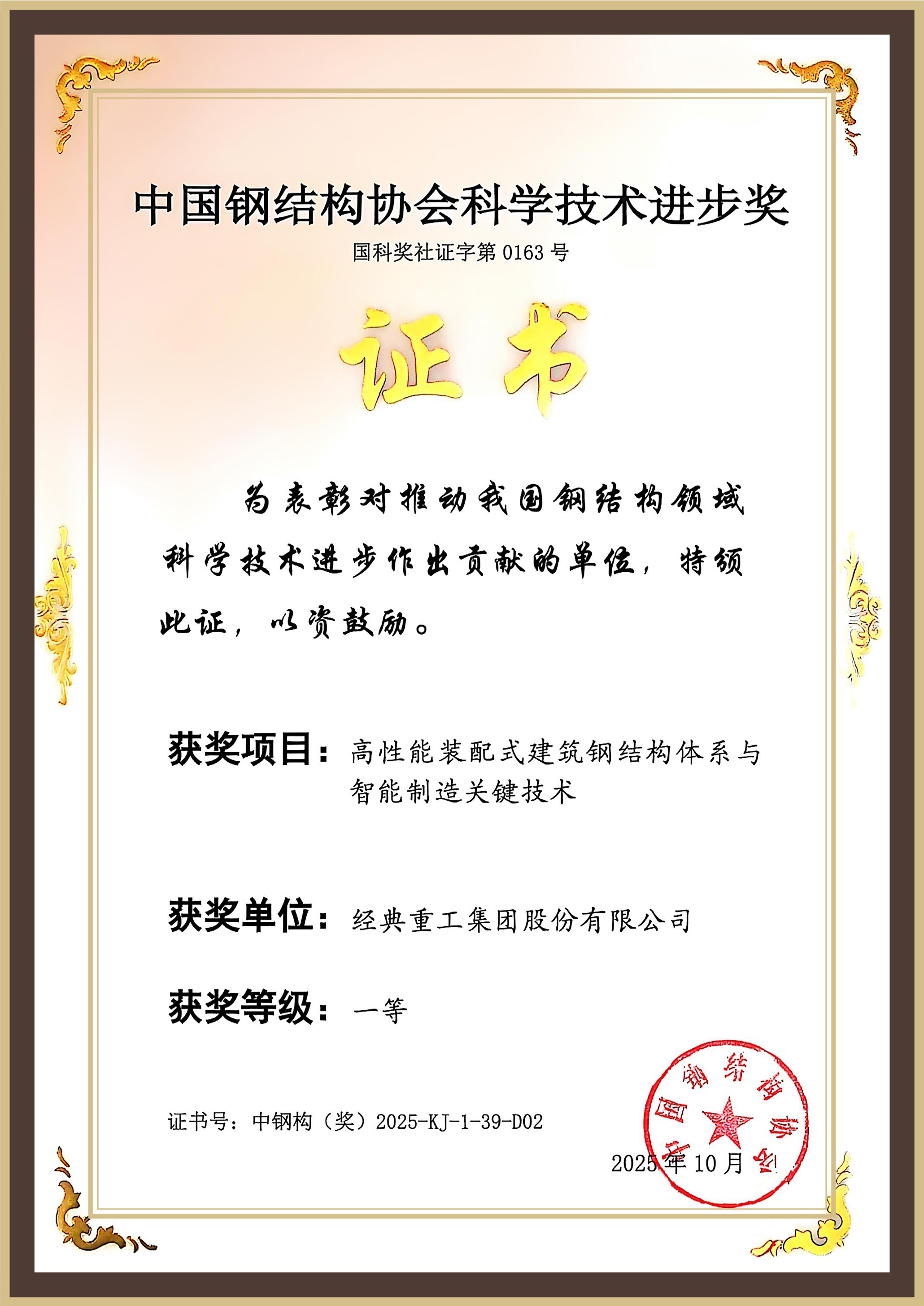 在科學技術獎頒獎典禮上,經(jīng)典重工集團股份有限公司作為主要科研單位參與的《高性能裝配式建筑鋼結(jié)構體系與智能制造關鍵技術》項目榮獲中國鋼結(jié)構協(xié)會科學技術進步獎一等獎。